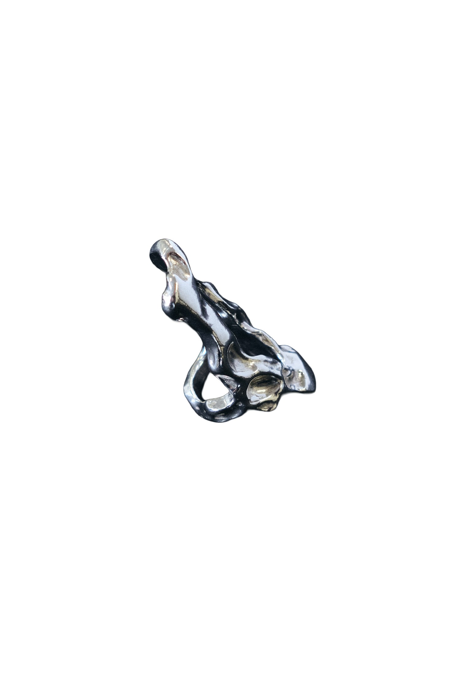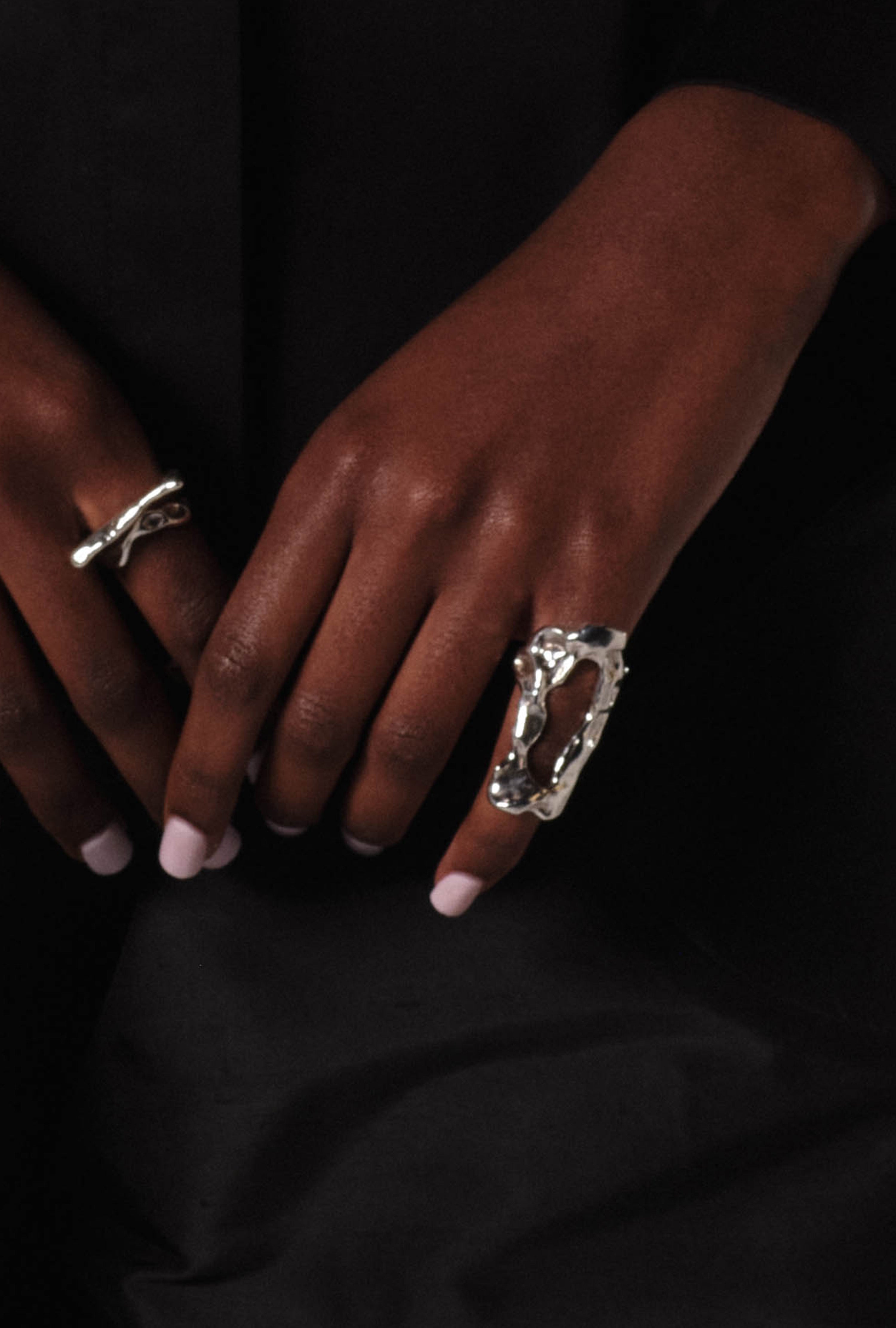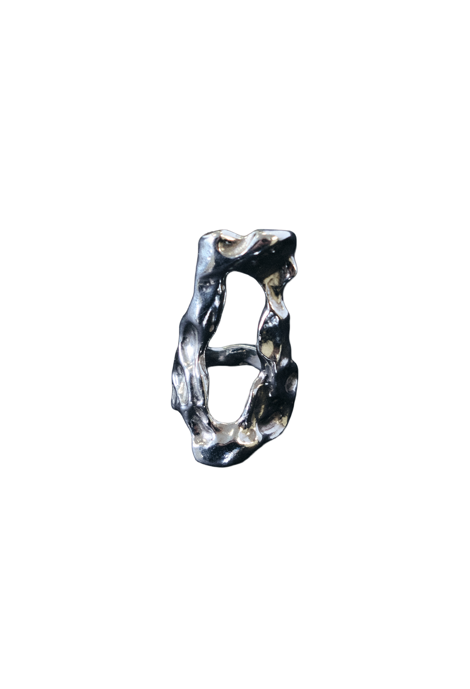 The Eden Ring is a hand-carved, sculptural piece made from recycled sterling silver, featuring a chunky, irregular, elongated shape with a hollow centre.