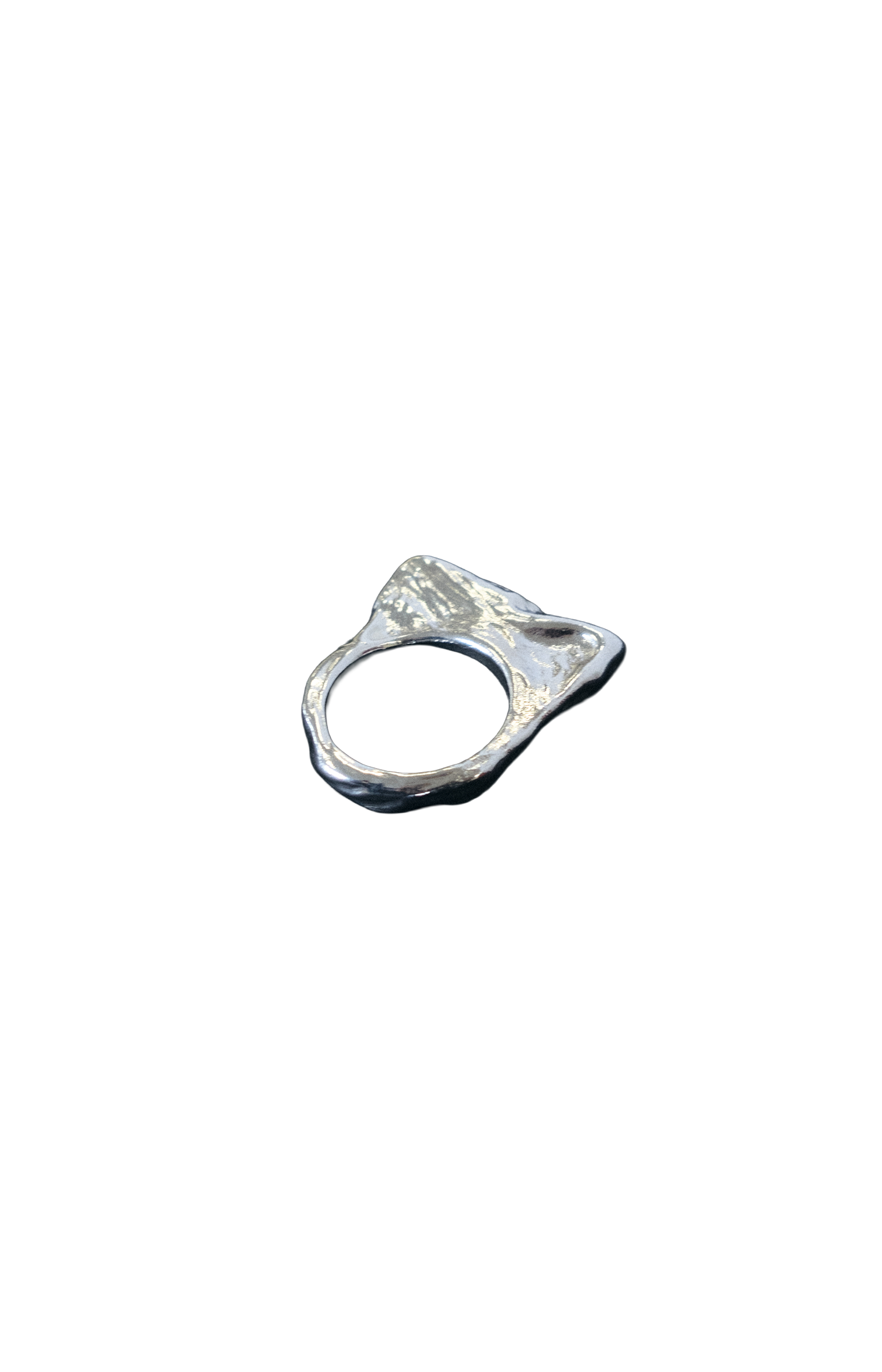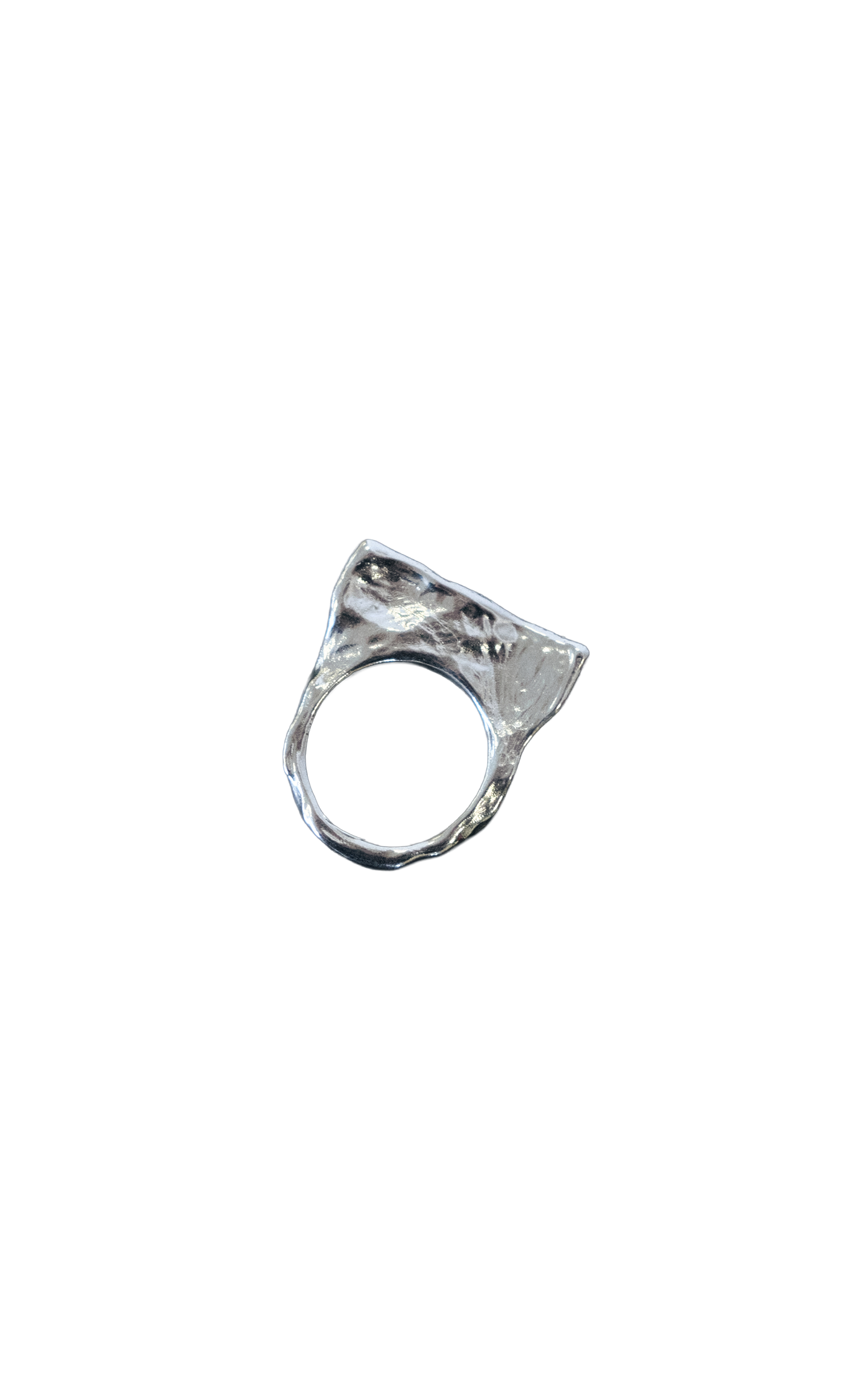 The Lala Ring is a hand-carved, geometric piece made from recycled sterling silver, featuring a thin profile from above and a thick, fluid form when viewed from the side. Its uneven surface adds a unique, organic touch to its bold yet simple design.