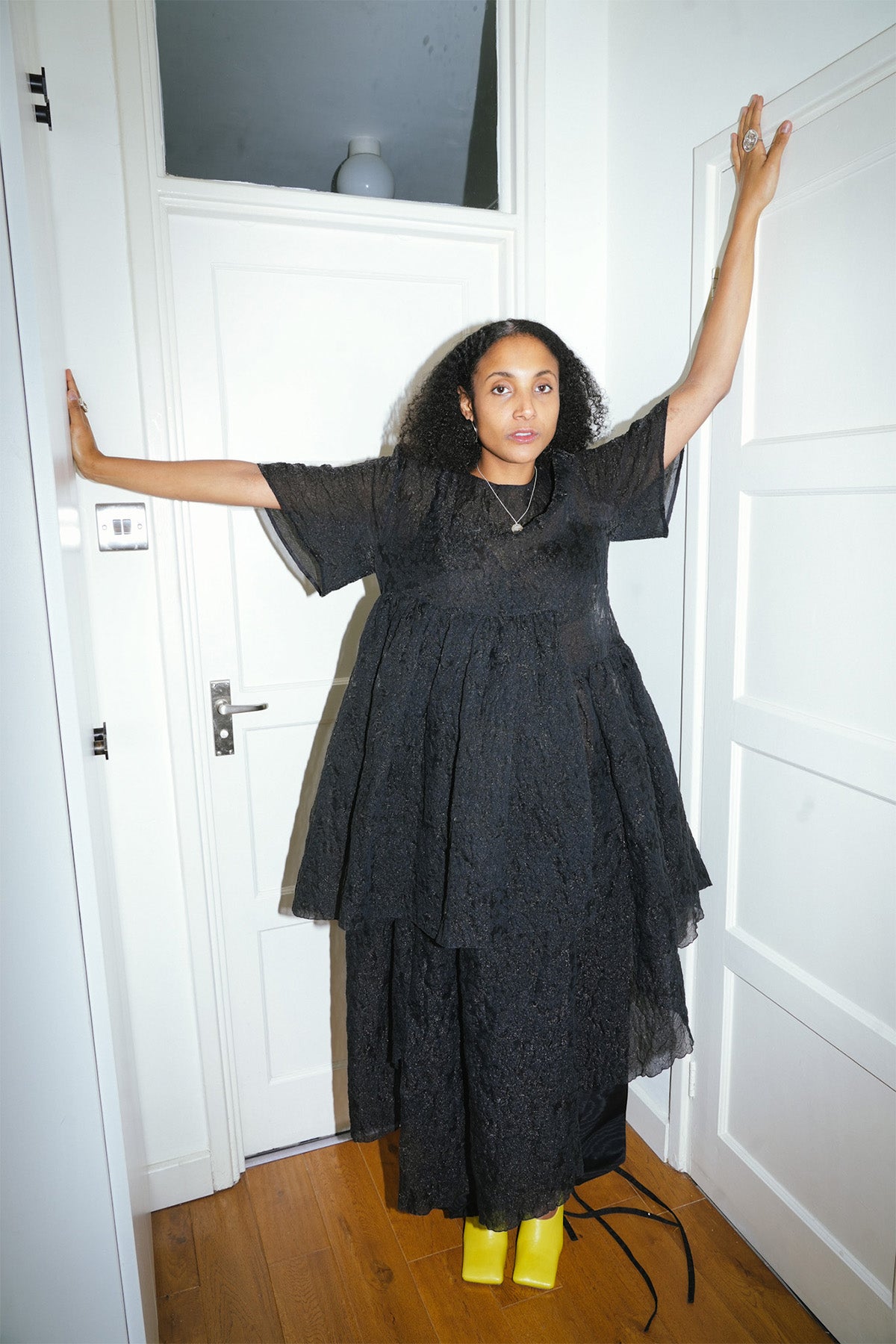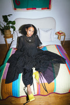 The Maeve Dress is made from a sheer, textured deadstock cotton-blend, it features multiple layers, a statement back bow, and an oversized silhouette.