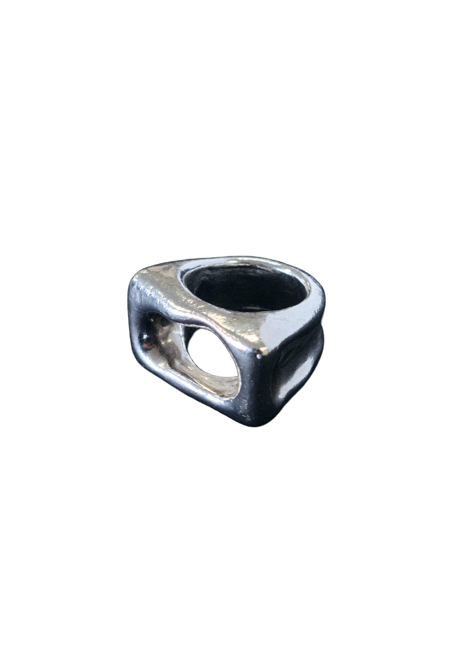 The Wynn Ring is a bold, hand-carved piece made from recycled sterling silver, featuring an irregular shape with a hollow cut-away section at the centre. From above, it forms a fluid rectangle around the finger.