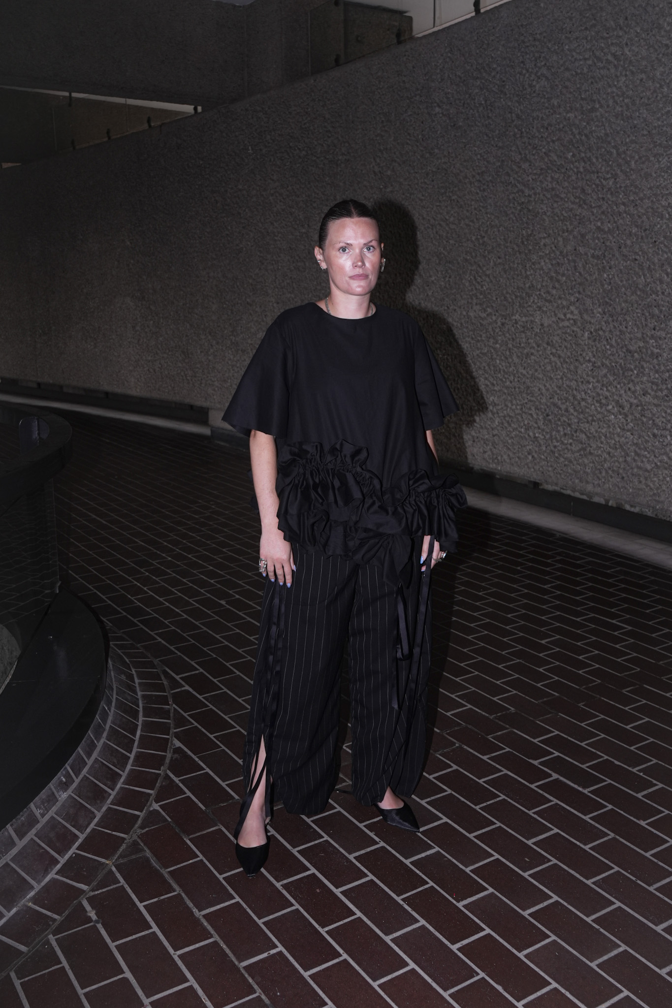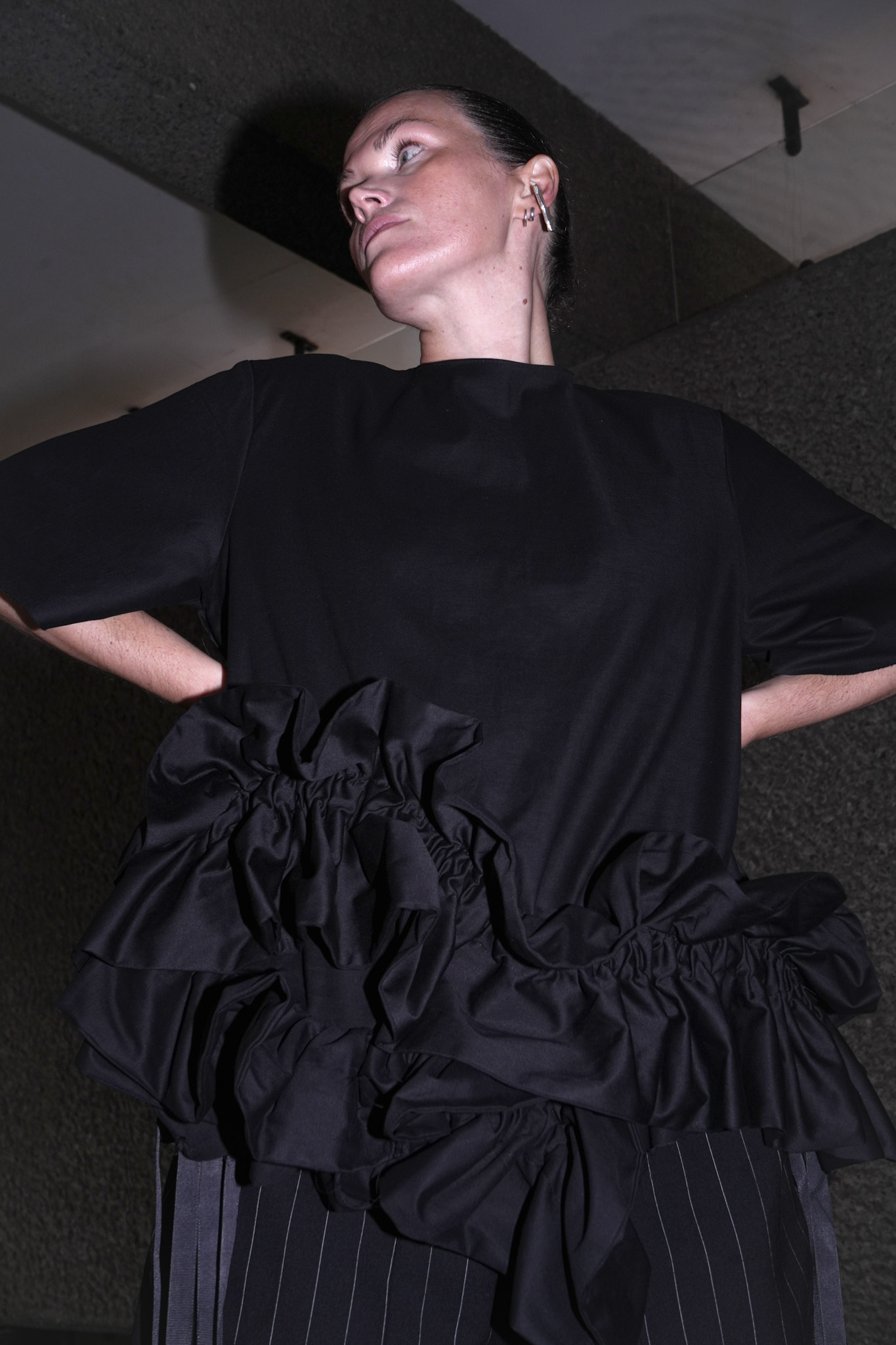 Ruched, asymmetric ruffles on front and back